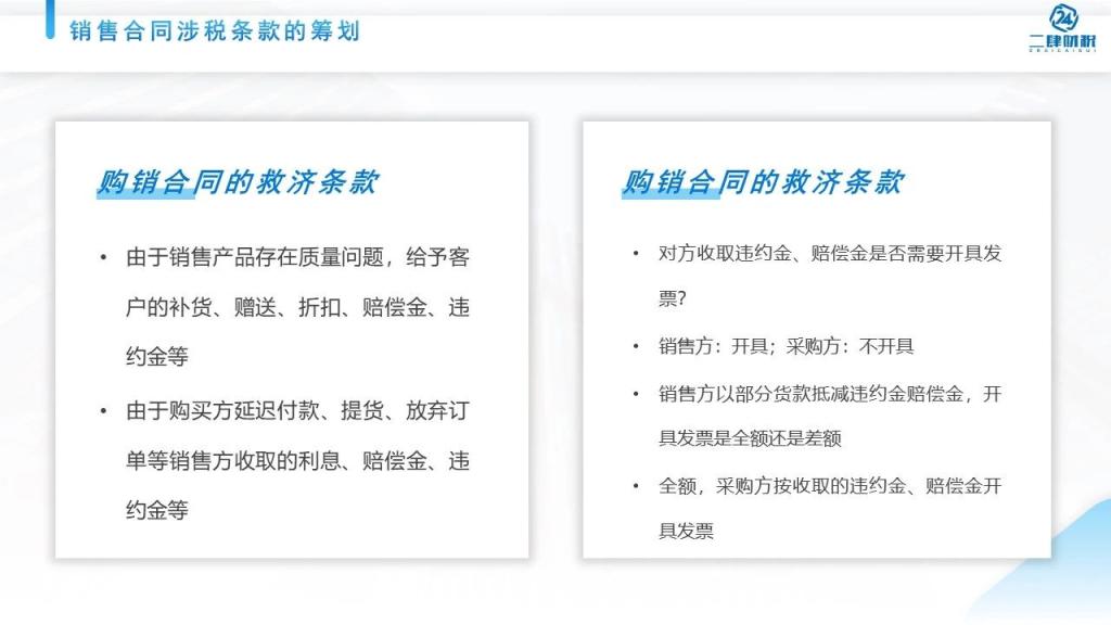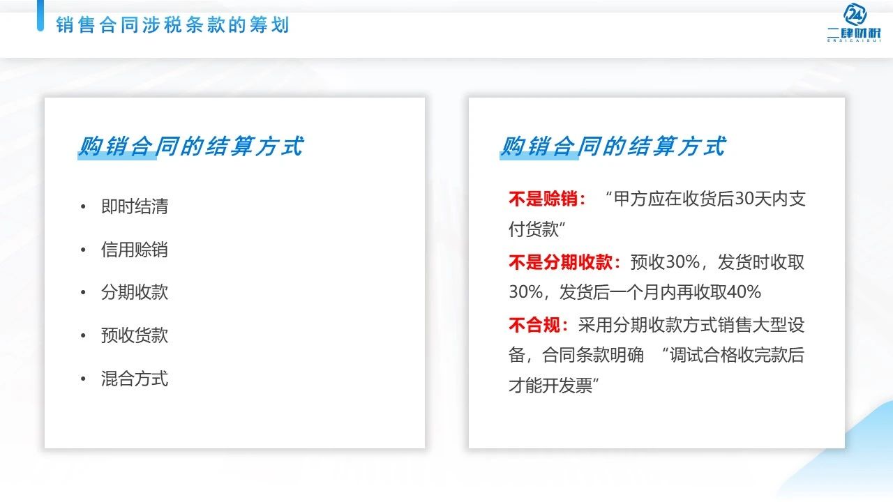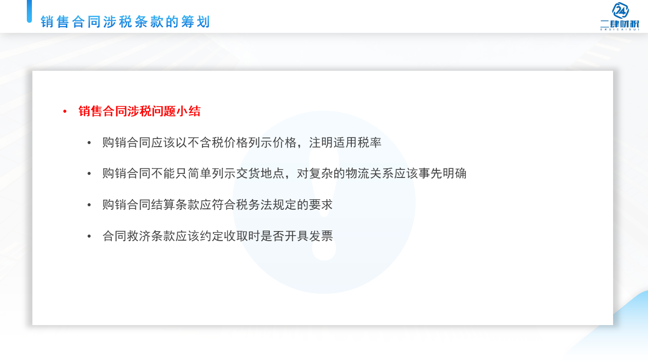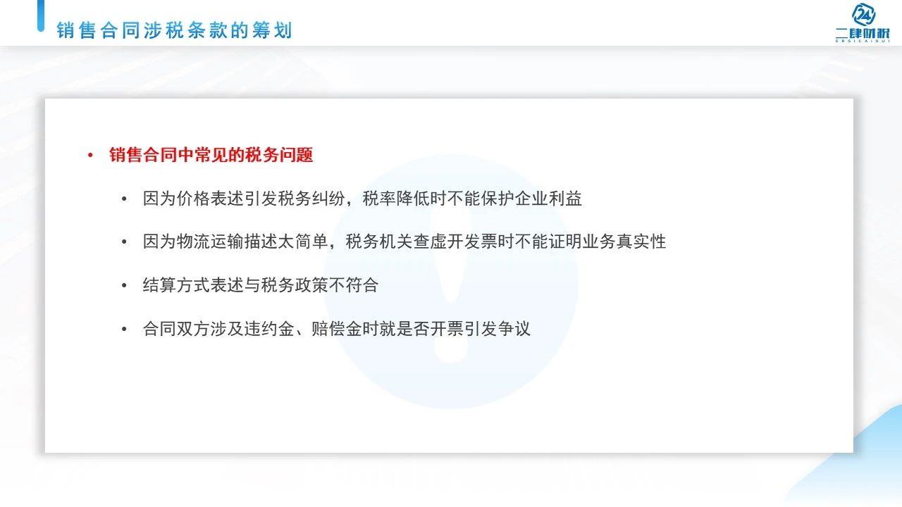 所以我们可以看到我们日常当中的销售的合同看起来很简单,但其实还是有很多跟税相关的。那么给大家总结一下,有4个要点提醒大家关注。
