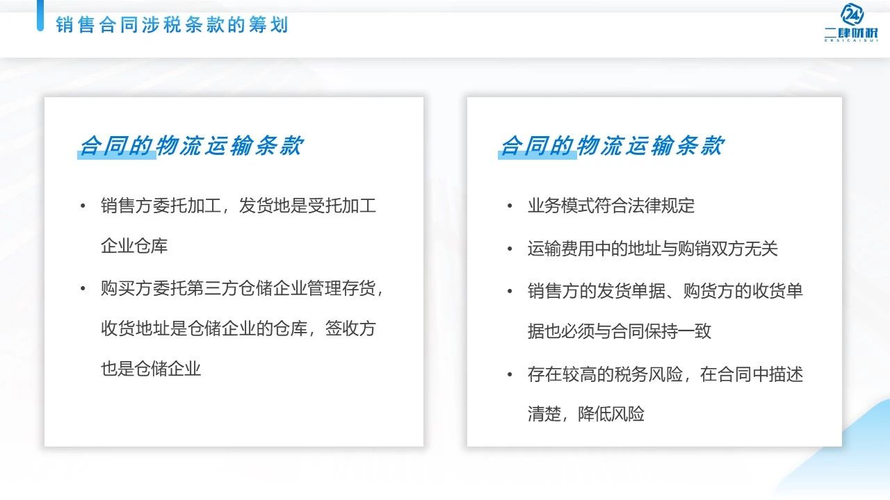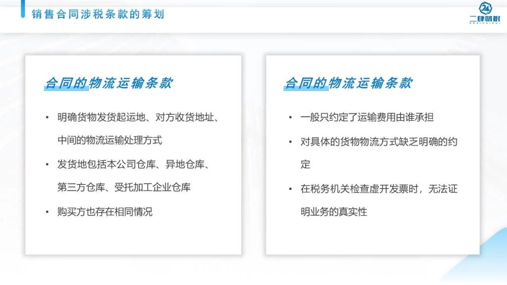 在我们企业合同当中还有个条款是物流运输的条款,很多企业物流运输条款写得很简单,这个问题在于当税务机关来检查我们业务的真实性的时候,我们能够提供说双方的合同跟双方的货物是一致的,发票是一致的,付款也是一致的。但一查到运输单据跟我们的业务又对不上了,这是我们企业常见的情况。