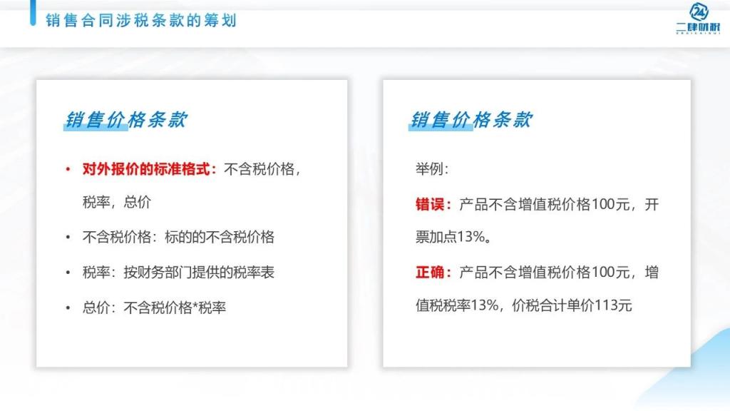 销售合同当中,价格条款我们建议对外报价的标准格式应该是不含税价、税率、总价,这是我们建议的合同表达条款。