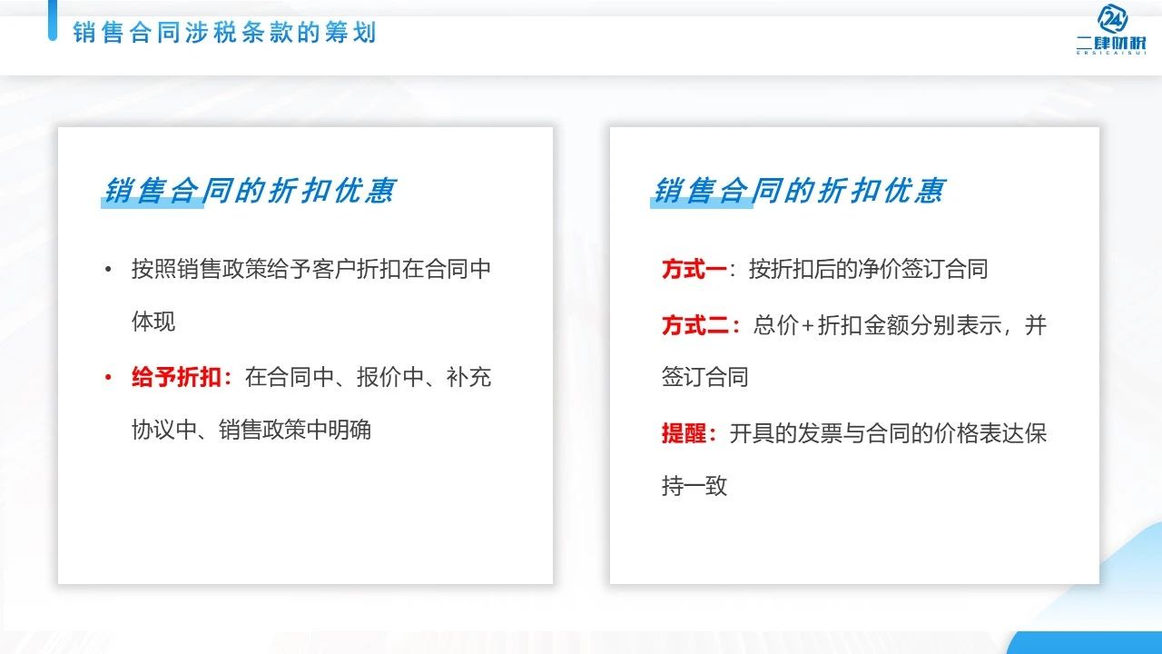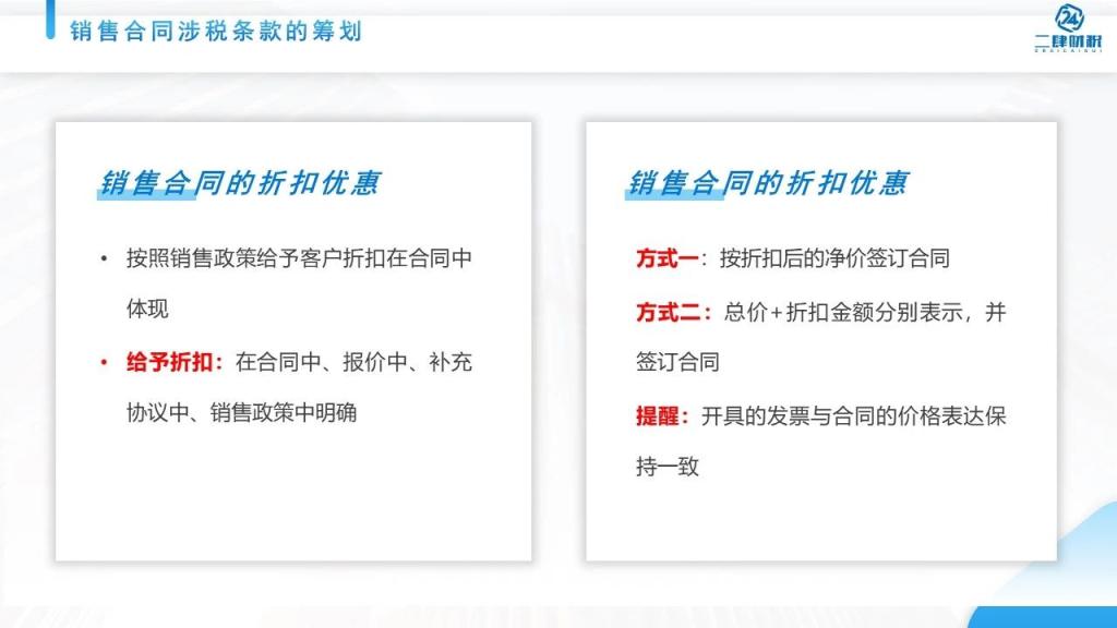 2种方法,总价是多少?折扣多少,折扣以后是多少,都分别列入到相关的合同当中,或者是报价单当中。这两种表达方式都没有问题,都符合税务的规定。但是我们开票的时候,一定要跟合同表达方式保持一致。这是我们讲的合同当中的价格优惠的问题。