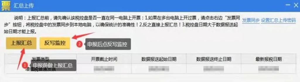 上报汇总前,请先确认该税务UKey是否一直在同一电脑上开票,如果在多台电脑上开过票,请点击右边【发票同步】按钮,进行发票修复,将税务UKey中的发票同步到本地电脑,以确保统计的准确性。