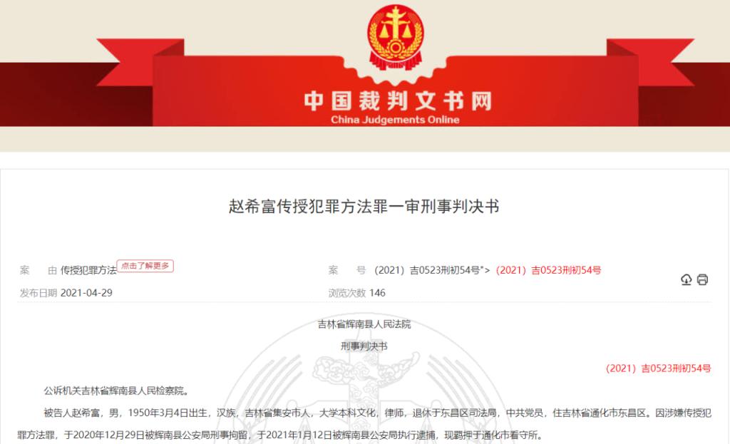 2021429日,中国裁判文书网披露《赵XX传授犯罪方案罪一审判决书》——《吉林省辉南县人民法院刑事判决书》((2021)吉0523刑初54号),该判决书披露: