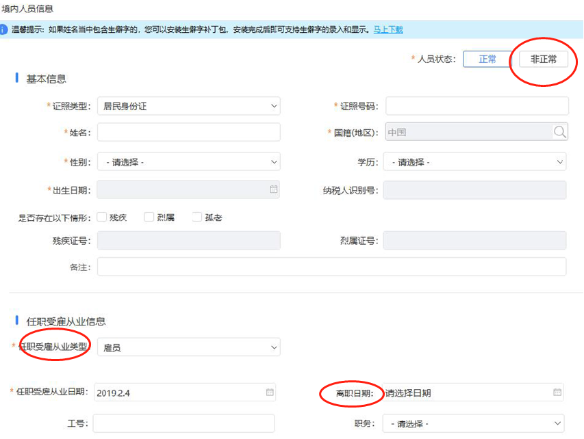 在扣缴端点击【人员信息采集】,选择申诉人员,确认为已离职人员的,在【人员信息】明细页面,填写实际离职日期,并将人员状态修改为“非正常”。