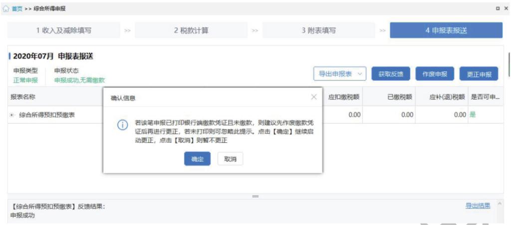 点击【综合所得申报】进入综合所得申报界面,点击【4 申报表报送】,点击【更正申报】按钮,启动更正申报。