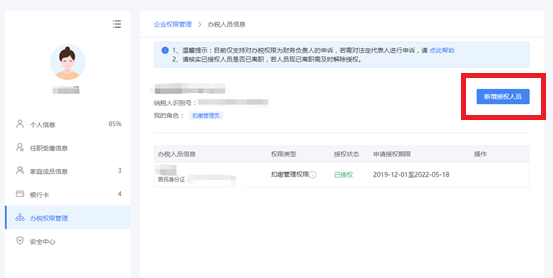 企业法人、财务负责人登录平台后,个人中心页面显示“企业办税权限”。“企业办税权限”自动展示当前任职受雇单位列表,可进行授权管理。