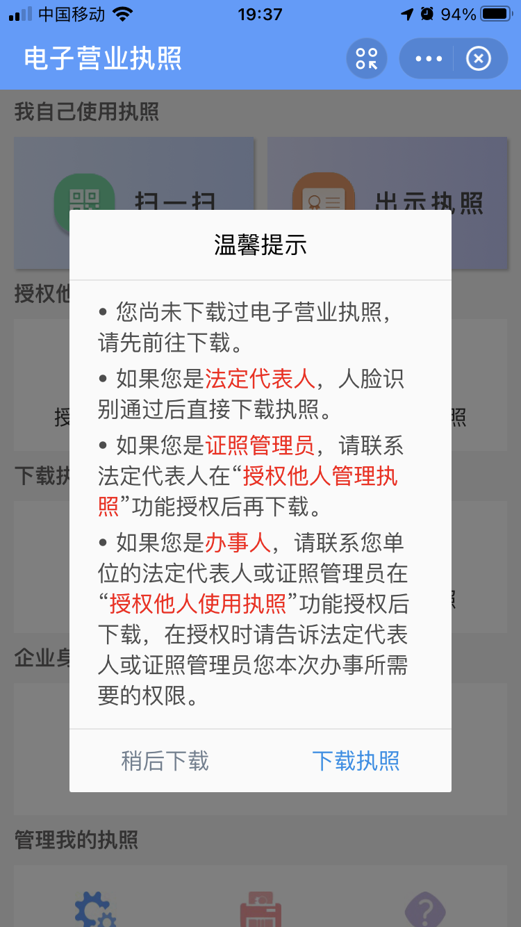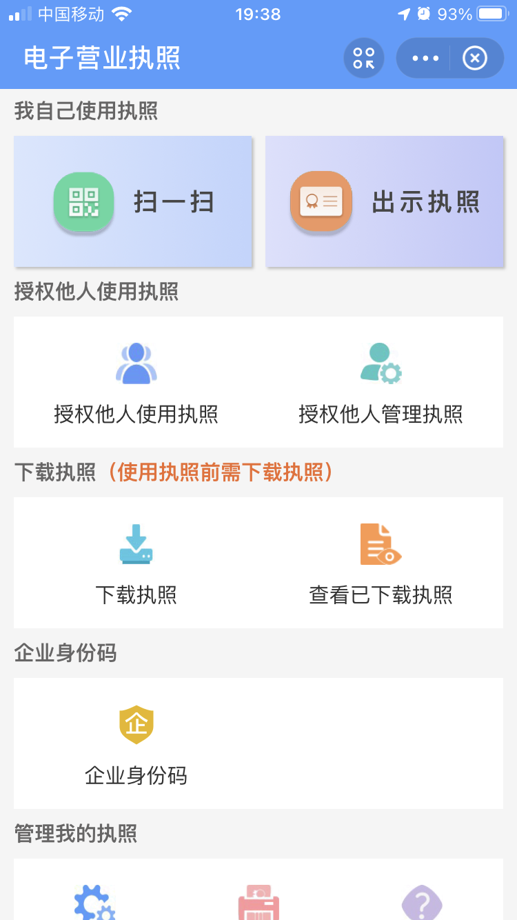 ()进入小程序后先进行实名认证——选择下载证照——选择企业登记地——电子执照生成下载——下载本企业电子营业执照。
