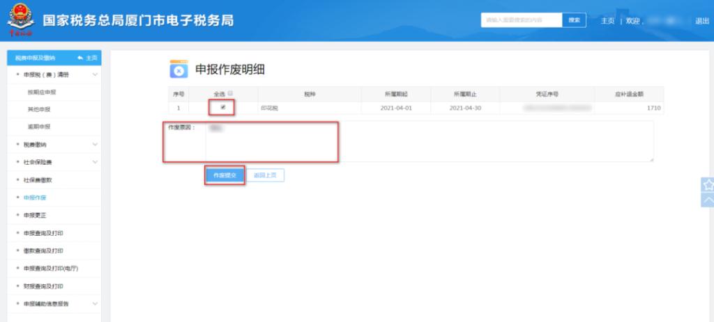 2、勾选需作废的税种信息,录入“作废原因”,点击“作废提交”: