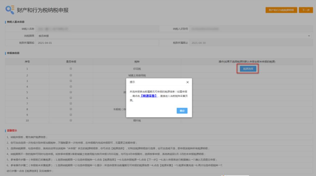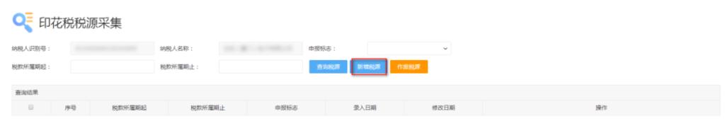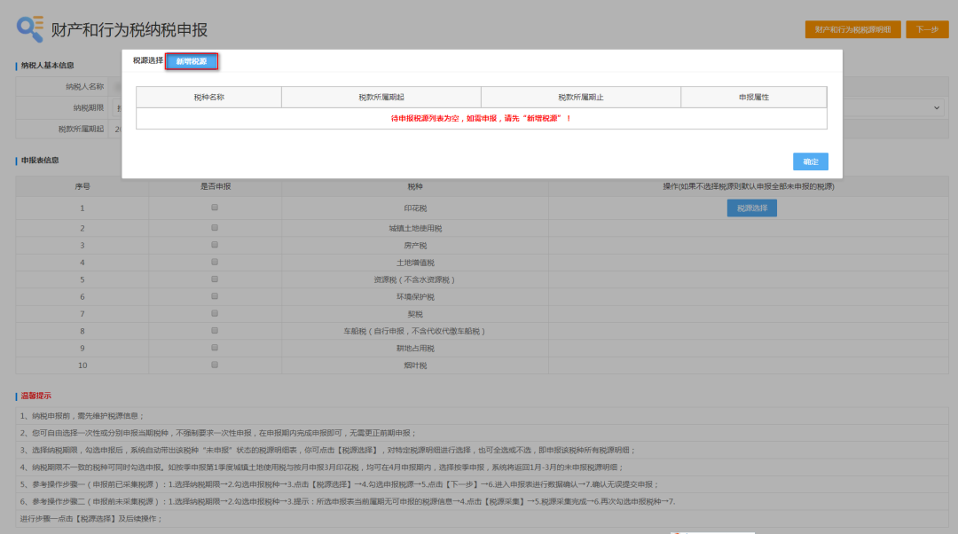 1.1 如系统提示“当前属期无可申报税源信息”时,可点击“税源选择”按钮进行新增税源操作: