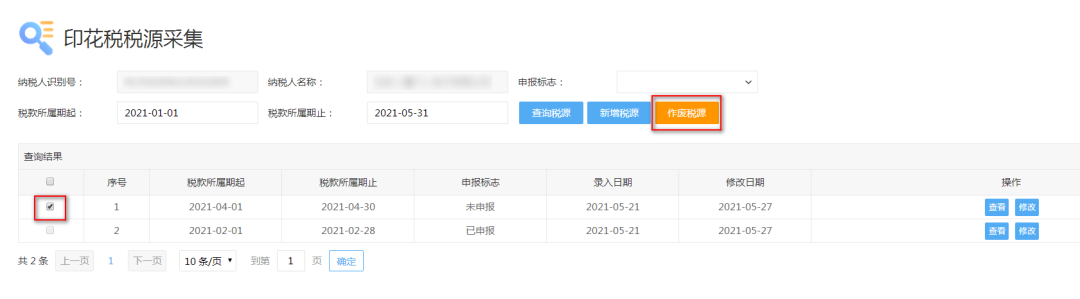 在【印花税税源采集】模块中,选中需作废的税源信息,点击“作废税源”: