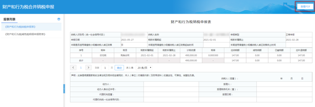 2、系统展示出申报表内容,如需打印点击“查看PDF”: