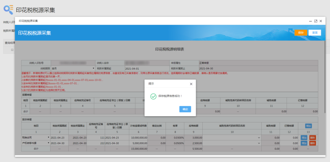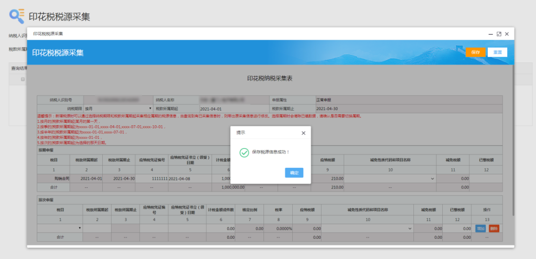 对于耕地占用税、印花税、资源税等一次性税源,纳税人可以在发生纳税义务后立即填写税源明细表,也可以在申报时填报所有税源信息。例如,某企业按月汇总缴纳印花税,分别在85日、10日、15日、20日签订应税合同,则可在当天立即填写印花税税源明细表,也可以在9月纳税申报期内,一并填报所有税源信息。