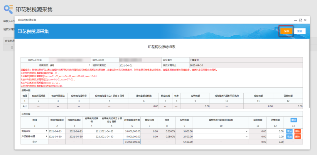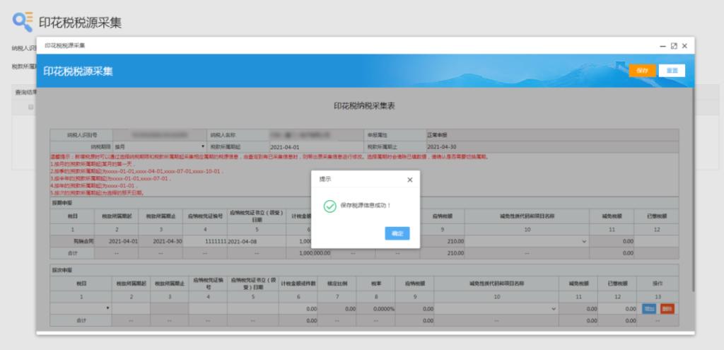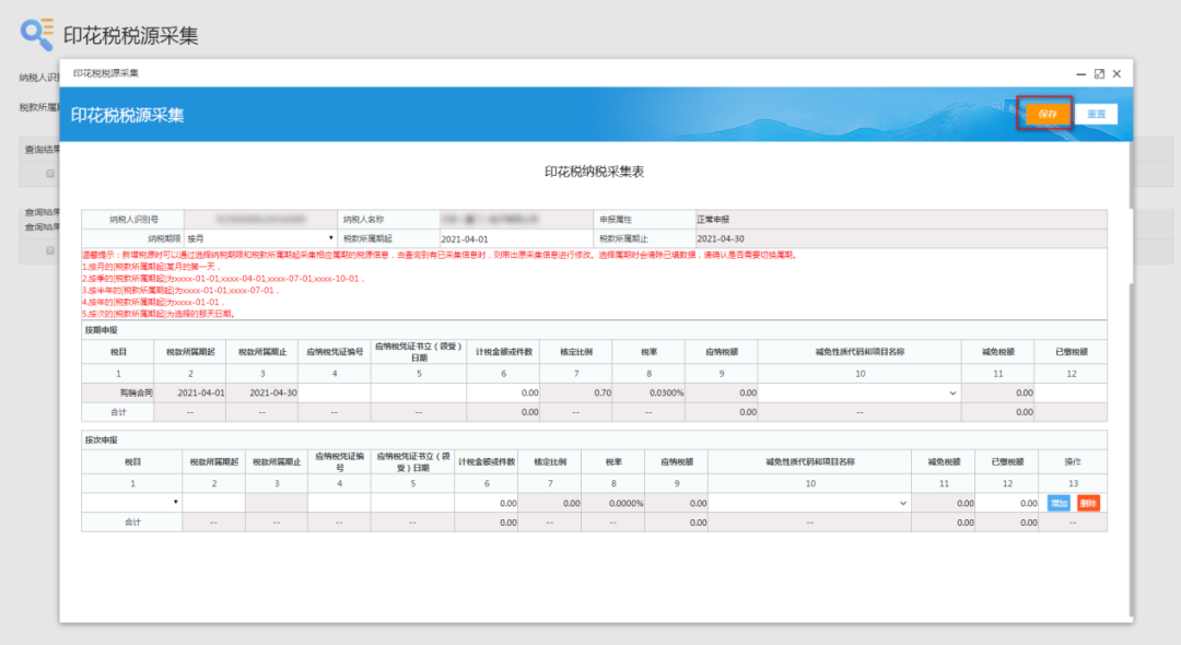 5、根据实际业务采集税源信息,点击“保存”: