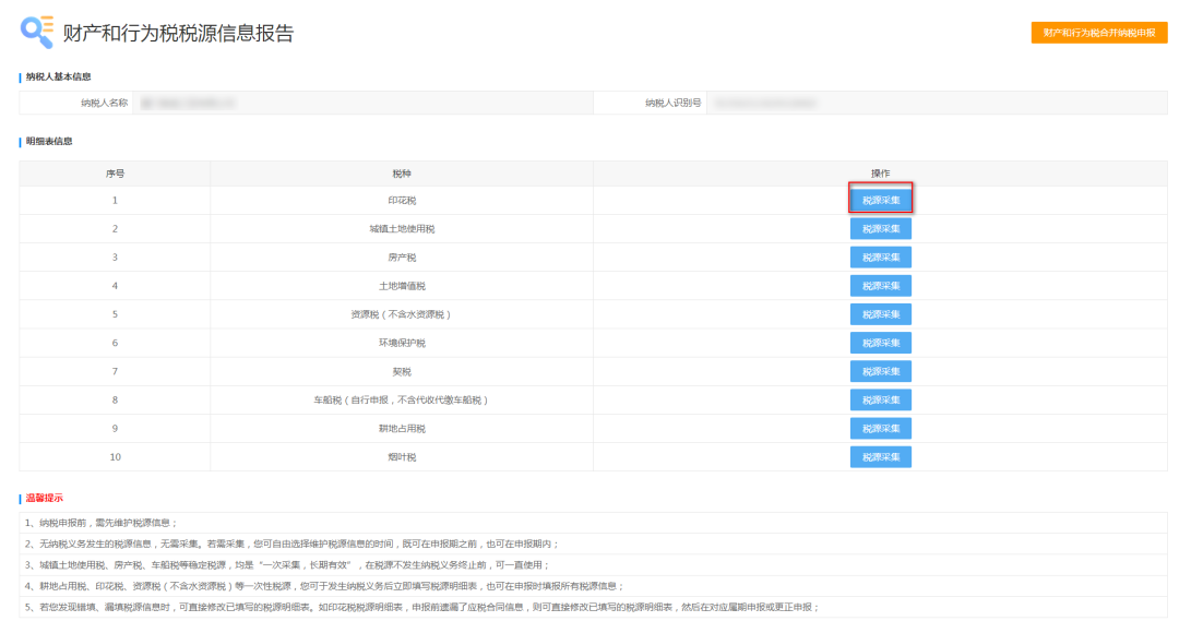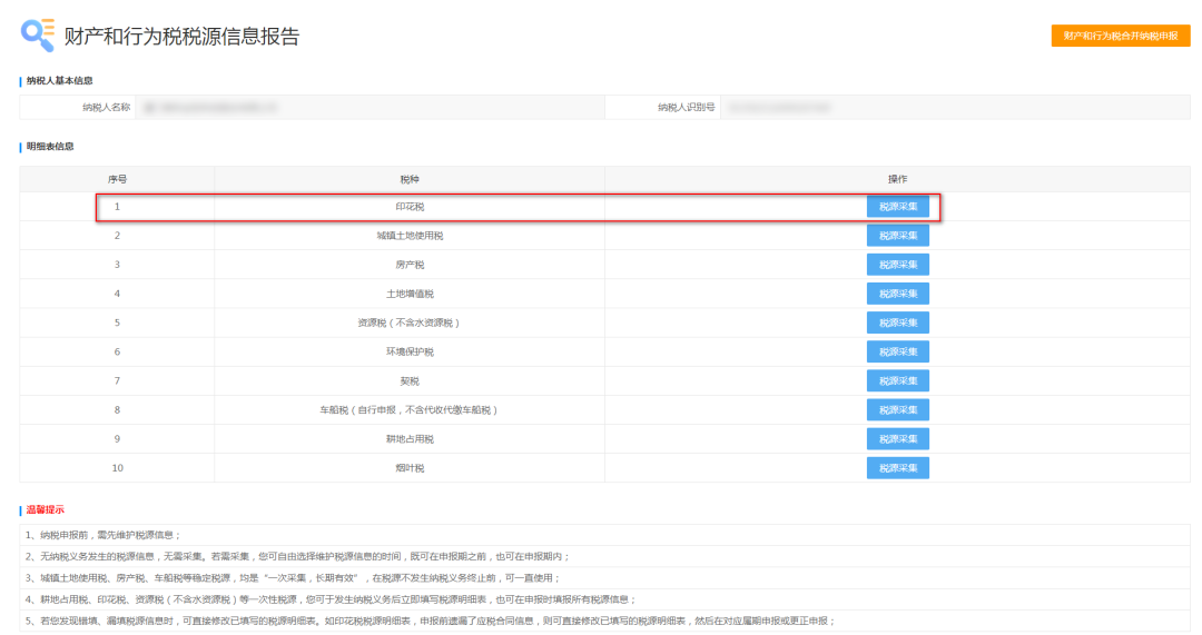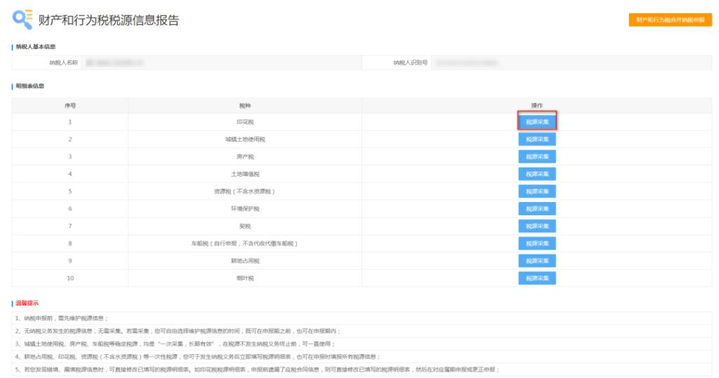 4、系统跳转至税源信息报告页面,选择需要更新税源的税种,点击“税源采集”:
