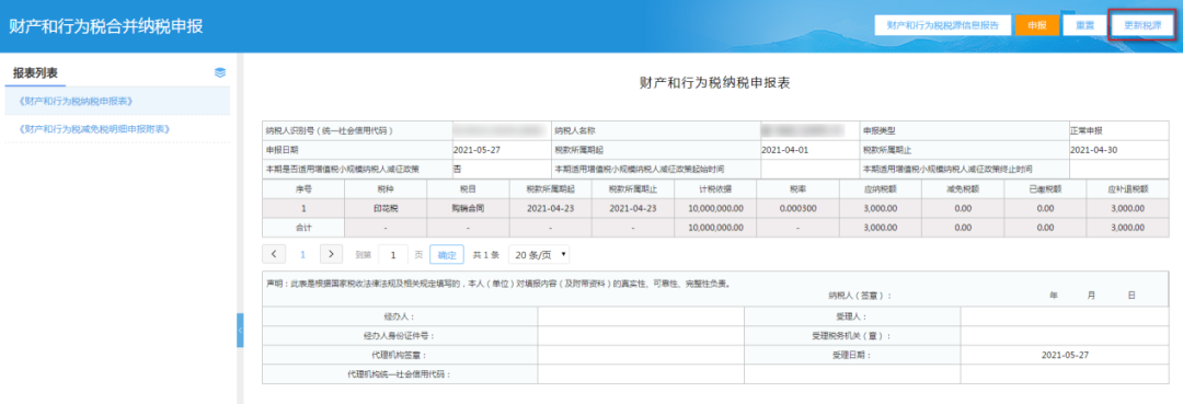 3、系统带出原申报表数据,更正申报表需要先更新税源信息,可点击“财产和行为税税源信息报告”。