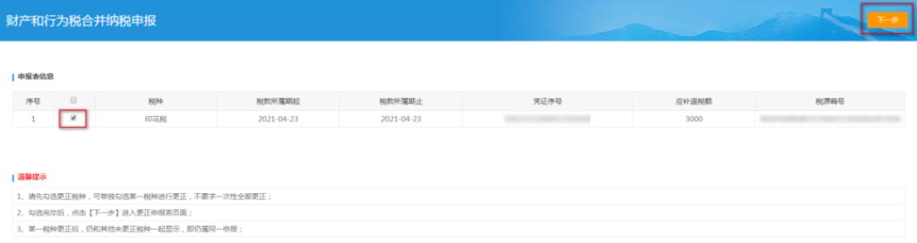 2、勾选需更正的税种信息,点击“下一步”:
