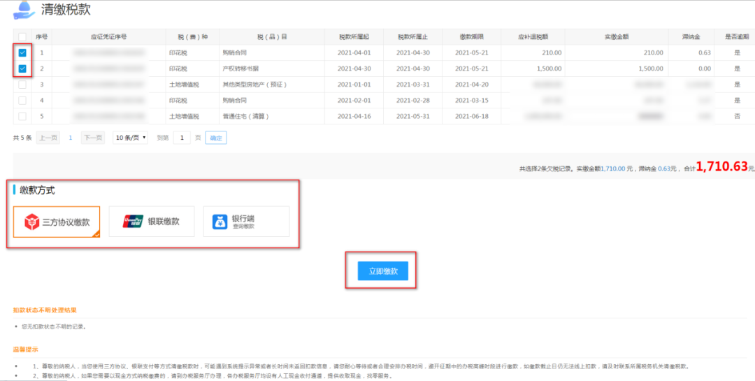 7、勾选需要缴纳的税款,选择“缴款方式”,点击“立即缴款”: