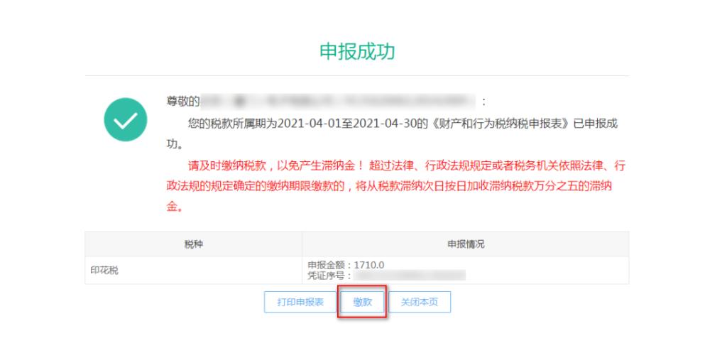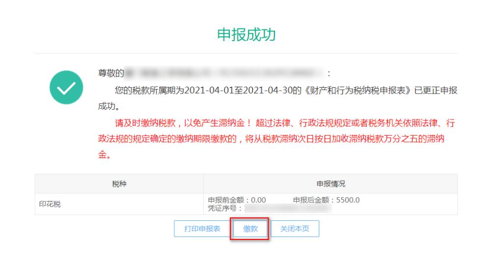 6、提示申报成功,如需缴纳税款请点击“缴款”进行缴款操作: