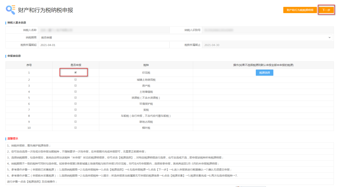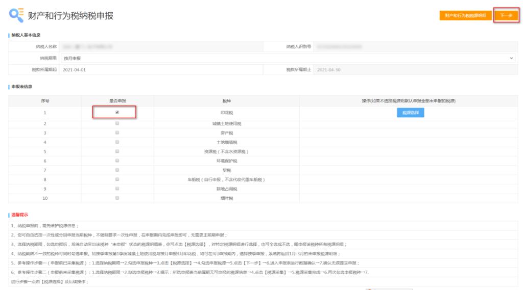 4、勾选对应的税种信息,点击“下一步”进行申报: