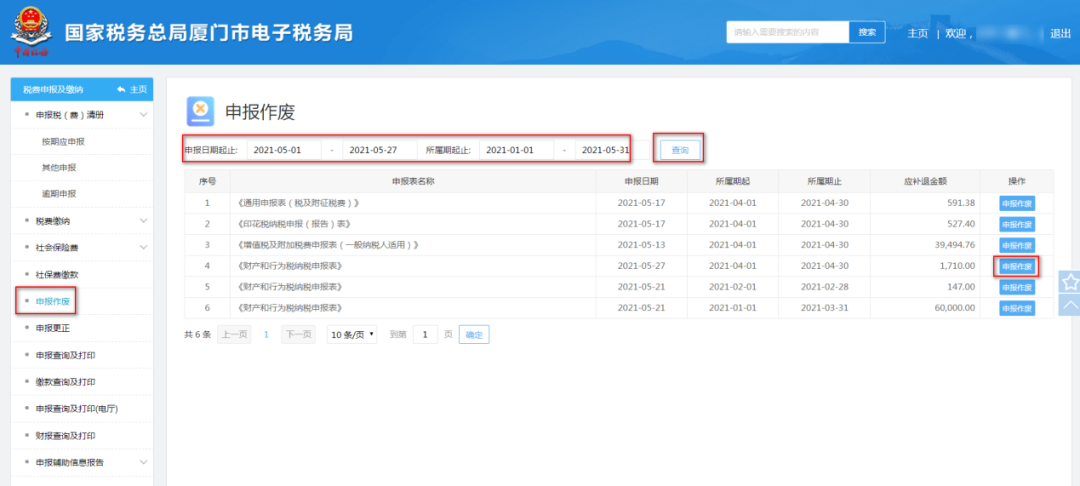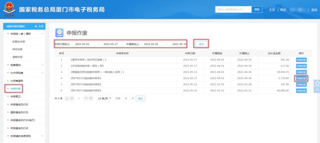 1、菜单中选择【申报作废】,录入“申报日期起止”、“所属期起止”等信息,点击“查询”,选择需作废的报表点击“申报作废”: