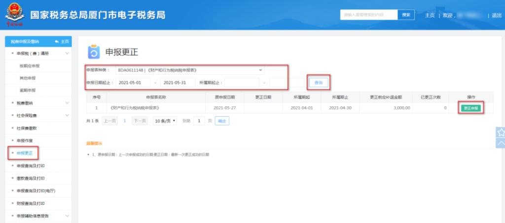 1、选择【申报更正】,录入“申报表种类”、“申报日期起止”或“所属期起止”等查询条件,点击“查询”,选择报表点击“更正申报”: