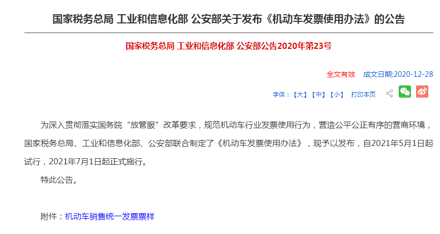 《机动车发票使用办法》,自2021年5月1日起试行,2021年7月1日起正式施行。
