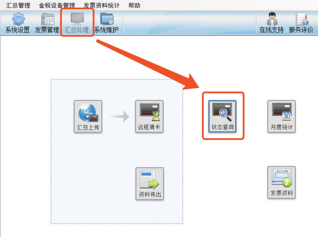 操作流程:点击【汇总处理】-【状态查询】-【增值税专用发票及增值税普通发票】。