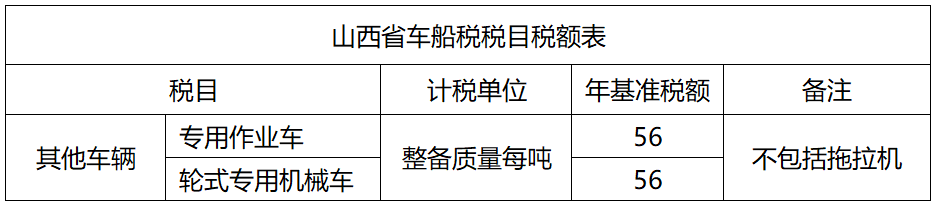经咨询办税人员,企业税务人员应当登录税务征管系统,登记未缴纳车船税的矿区胶轮车信息,并进行纳税申报。根据车船税暂行条例实施细则、车船税相关公告以及山西省车船税税目税额表可以判断出胶轮车属于运输设备中的“专用作业车”,山西省按照 “整备质量每吨”为计税单位,56/吨申报缴纳车船税。