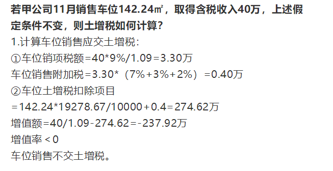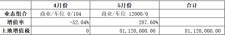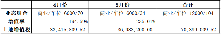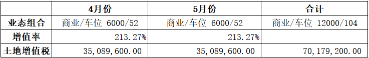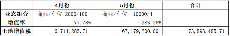 第二组:车位和商铺适当搭配销售,4月份销售商业2000平方,销售车位100个;5月份销售商业10000平方,销售车位4个。土地增值税计算演示如下: