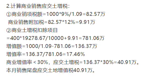 第四组:商业和车位都按照50%的比例推进销售,土地增值税计算如下: