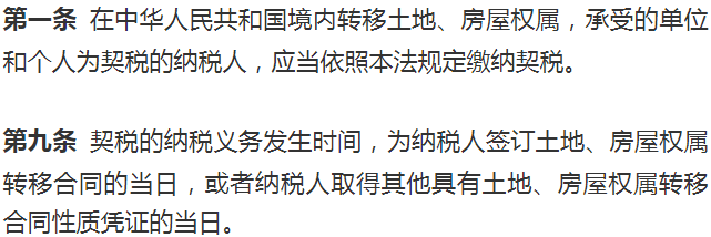 依据上述文件可知,契税的纳税义务人为房屋产权的承受方,纳税义务时点,可以自“签订房产转移合同的当日”“取得房屋转移凭证的当日”二选其一。如未办理产权但已开始使用,小编认为,最晚应于办理房屋产权登记之前缴纳契税。