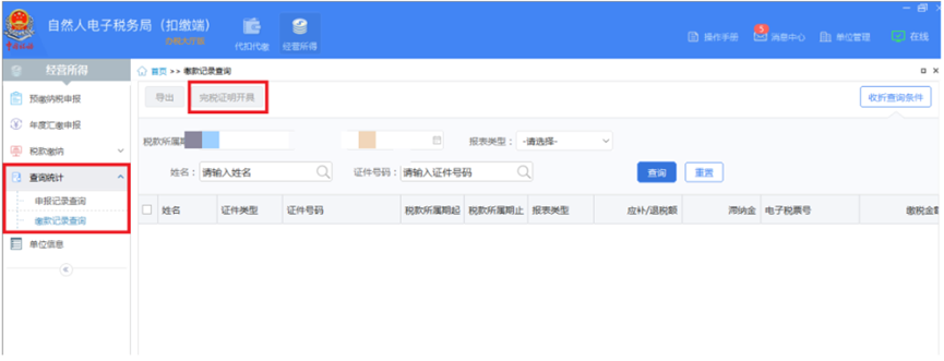(四)打印完税证明,点击左侧菜单【查询统计】-【缴款记录查询】-【完税证明开具】。