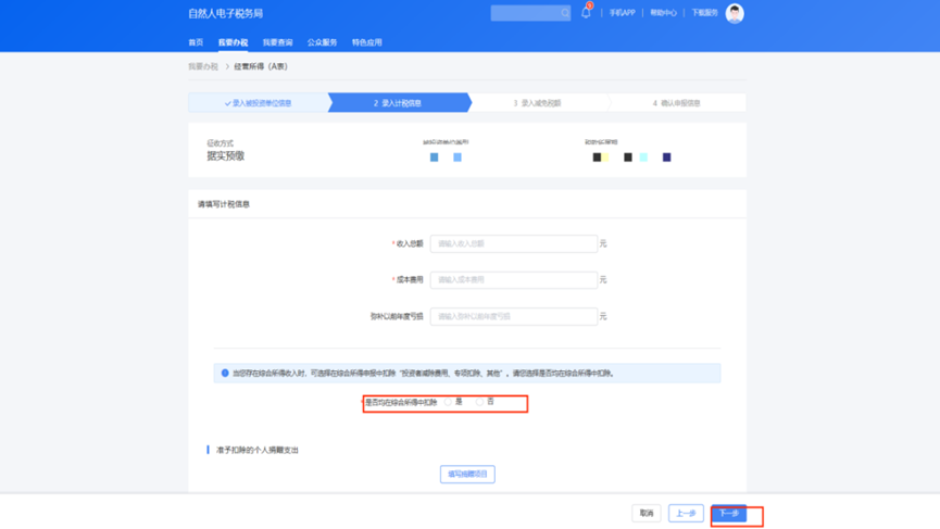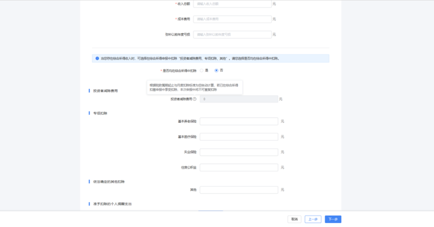 注:当您存在综合所得收入时,可选择在综合所得申报中扣除“投资者减除费用、专项扣除、其他”,请您选择是否均在综合所得中扣除。