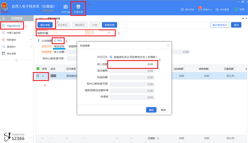 (二)点击【经营所得】—【预缴纳税申报】,勾选下方的法定代表人—点击【修改】,据实填写截止到税款所属期止的当年累计收入总额、累计成本费用等信息,保存数据后完成【提交申报】以及【获取反馈】操作,系统提示申报成功即可。