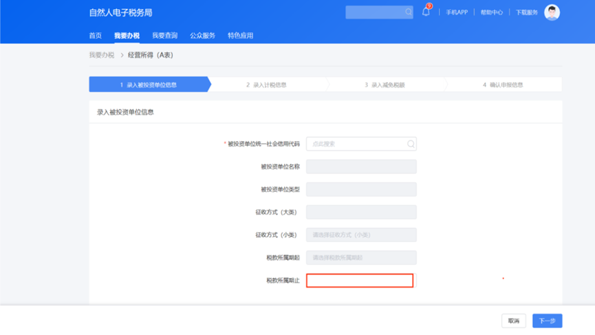 4.在【税款所属期止】输入日期,点击【下一步】。