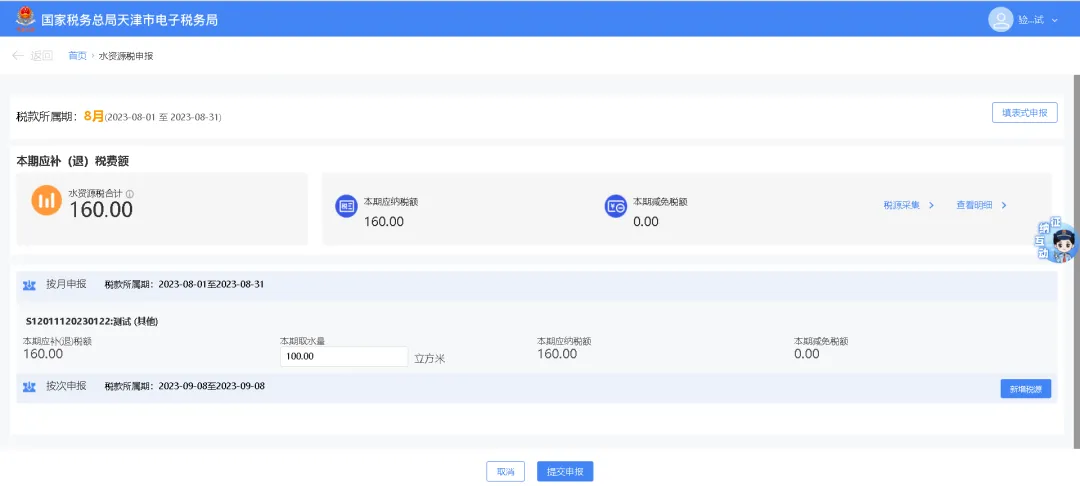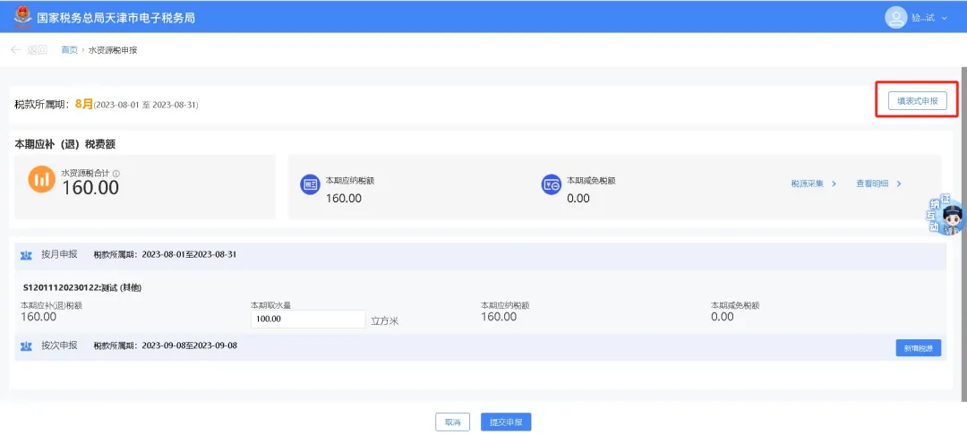 进入功能界面,点击【填表式申报】。系统跳转到水资源税申报信息界面,系统自动带出本期应申报的水资源申报信息,根据采集时选择的取用水行业类型,自动匹配适用《水资源税申报表A表》或《水资源税申报表B表》。点击税源编号,可跳转到《水资源税申报表A》界面(或者《水资源税申报表B》界面)。