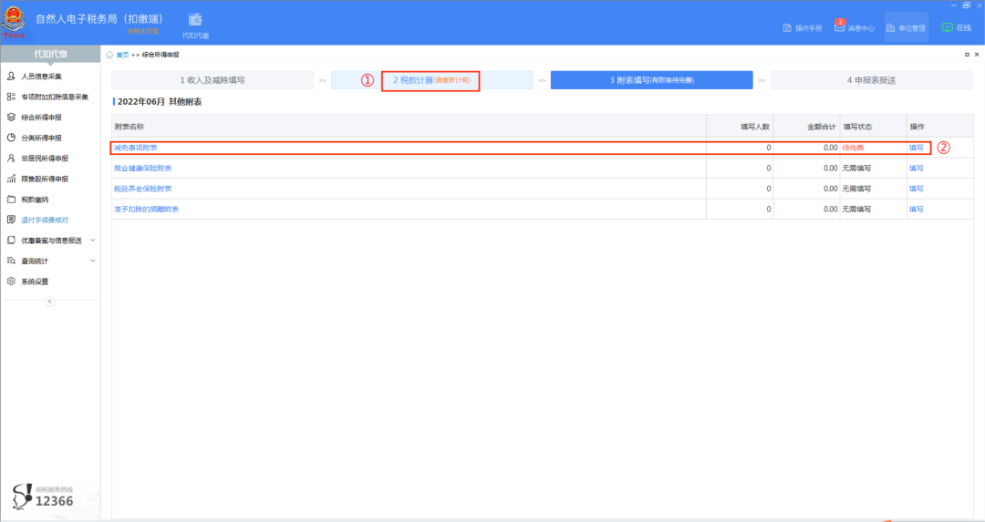 点击“税款计算”后,在“附表填写”界面点击“减免事项附表”或相对应后面的【填写】,进入“个人所得税减免事项报告表”。