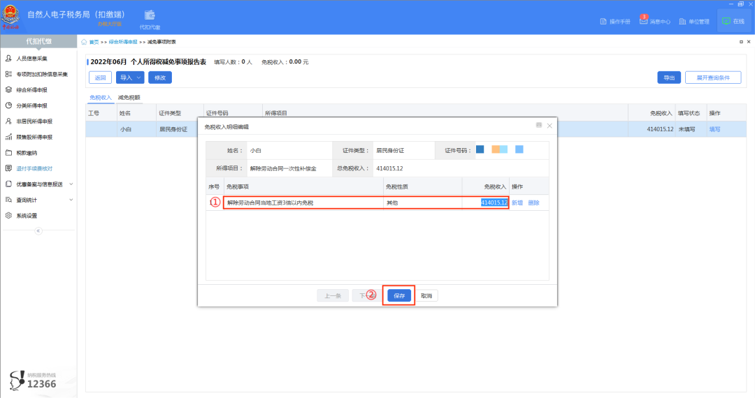 在“免税收入”下点击【填写】,进入免税收入明细编辑后,选择免税事项“解除劳动合同当地工资3倍以内免税”、选择免税性质“其他”、填写“免税收入”,点击【保存】。