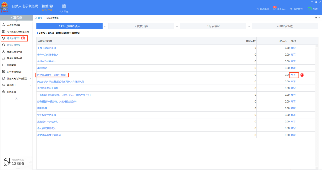 登录扣缴端后,点击“综合所得”,在“收入及减除填写”界面选择“解除劳动合同一次性补偿金”或相对应后面的【填写】,进入填写界面。
