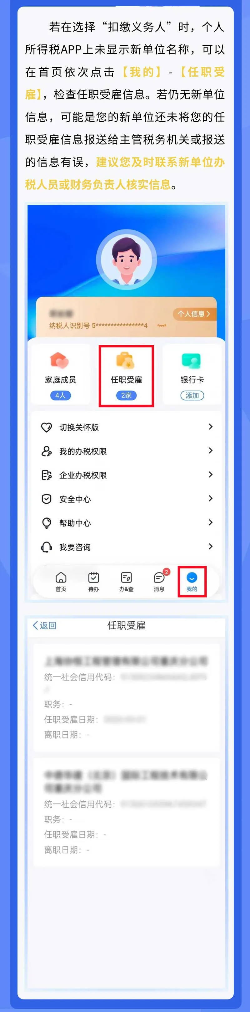 更换工作单位后,新单位没有自己的个税专项附加扣除信息,如何才能在发工资时继续享受专项附加扣除呢?别着急,只需要在个人所得税APP变更扣缴义务人就能轻松解决!手把手教你如何操作,一起来看看↓