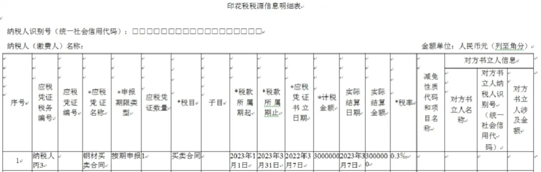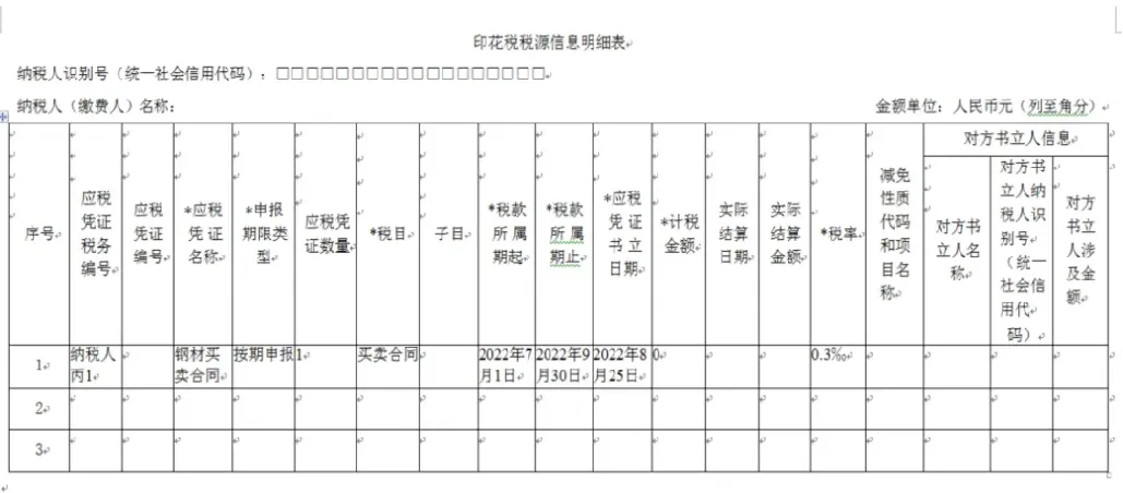 纳税人丙按季申报缴纳印花税,2022年8月25日书立钢材买卖合同1份,合同列明了买卖钢材数量,并约定在实际交付钢材时,以交付当日市场报价确定成交价据以结算,2022年10月12日按合同结算买卖钢材价款100万元,2023年3月7日按合同结算买卖钢材价款300万元。该纳税人应在书立应税合同以及实际结算时,填写《印花税税源明细表》,分别在2022年10月、2023年1月、2023年4月纳税申报期,进行财产行为税综合申报,具体如下: