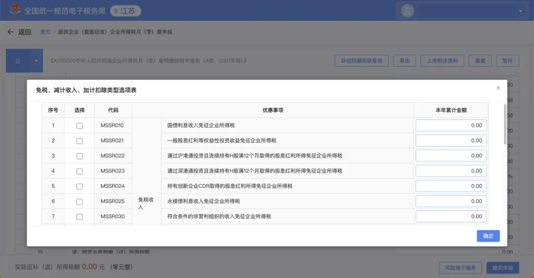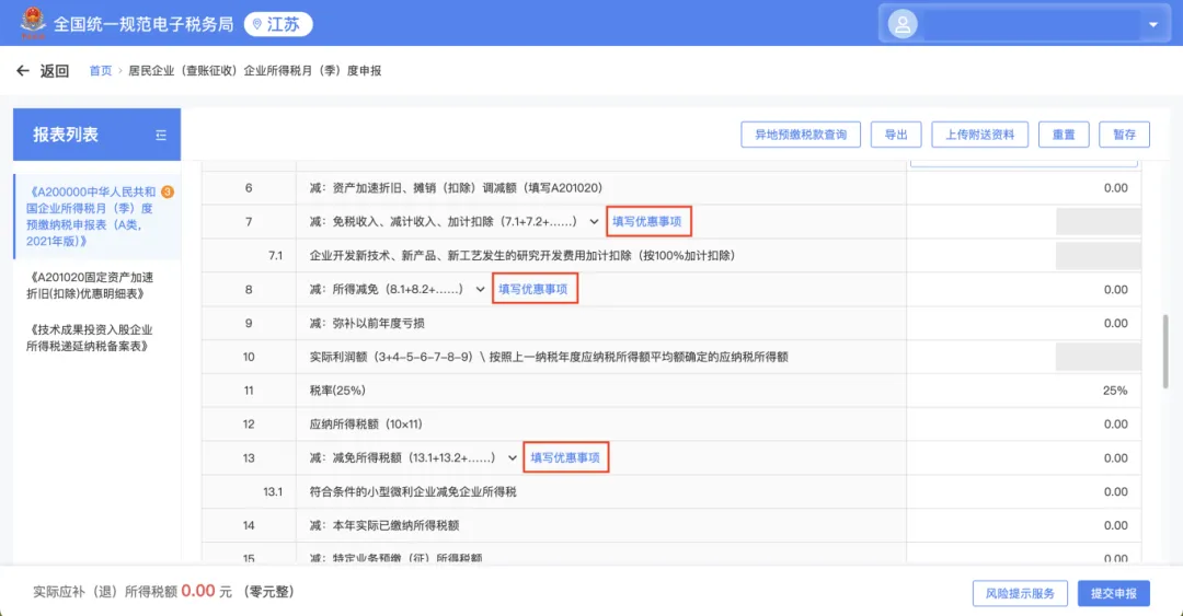 若存在免税收入、减计收入、加计扣除、所得减免或减免所得税额情形,可点击主表第7、8、13栏的【填写优惠事项】,进行勾选和填写。