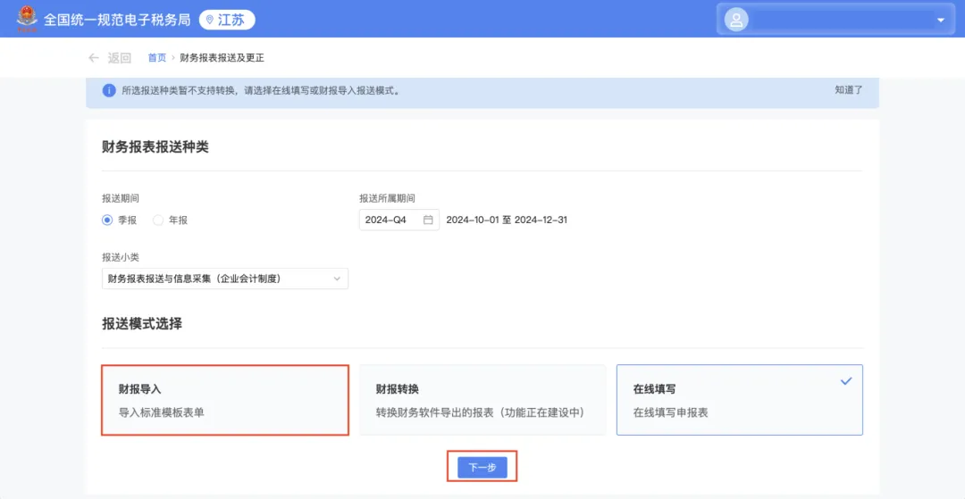 系统会根据纳税人财务会计制度及核算软件备案报告自动带出需报送的财务报表报送种类。以财报导入模式和在线填写模式为例: