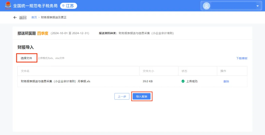 ②点击【选择文件】上传已填写的模板,点击【导入报表】-【提交申报】。