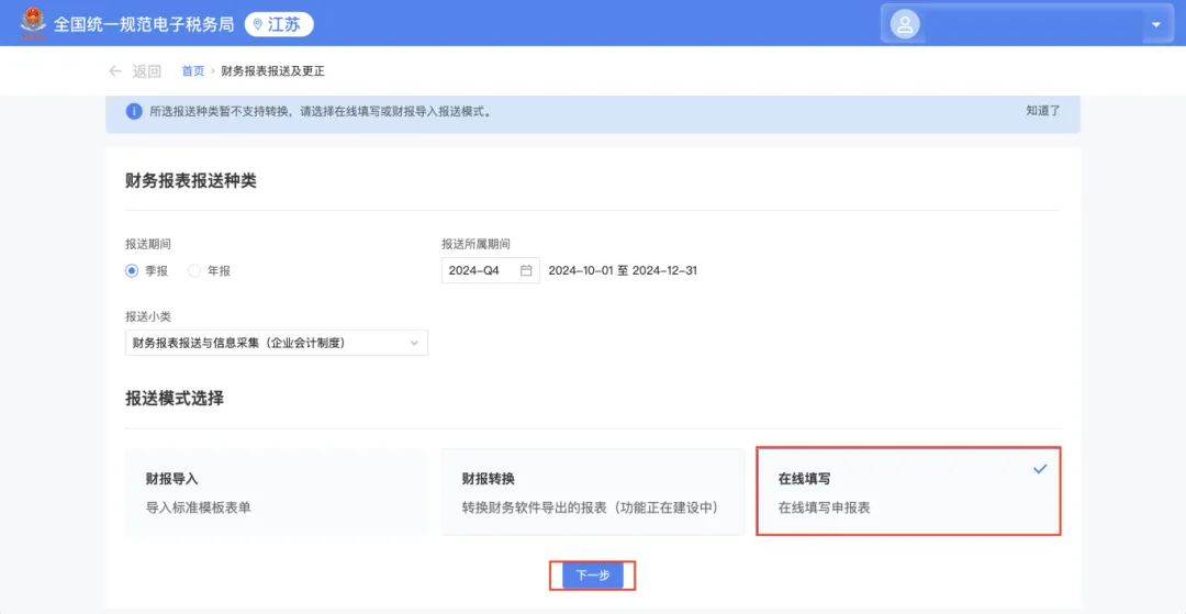 ①点击【在线填写】-【下一步】,进入报表在线填写界面,左侧列表可切换填报其他表单。填写完成后,点击【提交申报】。