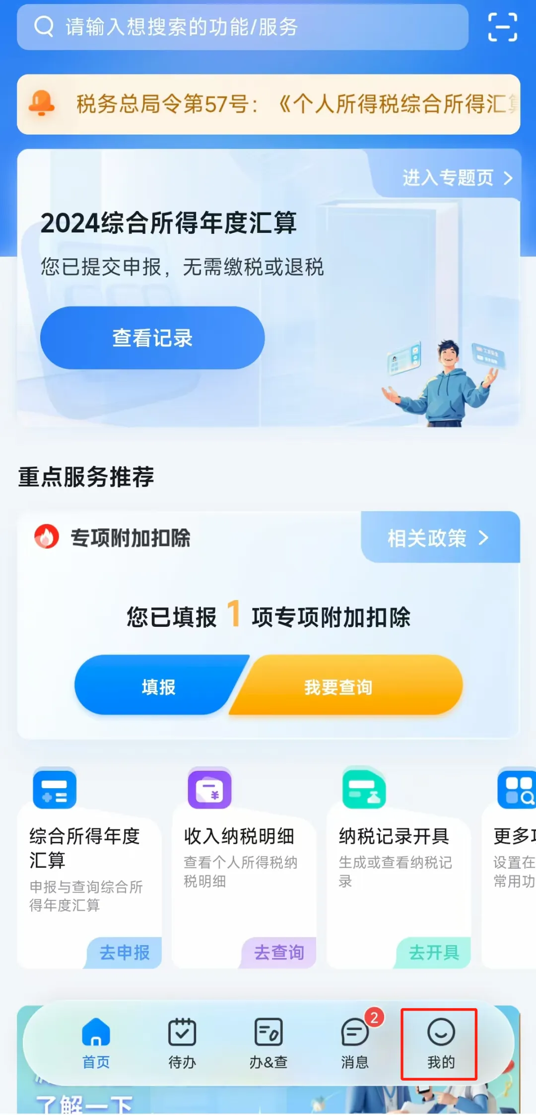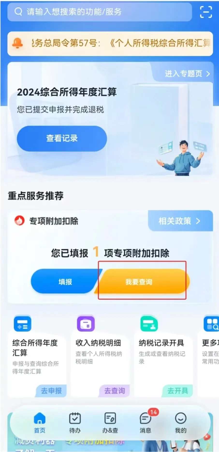 第二步:在首页“重点服务推荐”模块,点击【我要查询】,进入专项附加扣除界面后,选择查询年度【2025】,点击填报记录中的专项附加扣除项目。