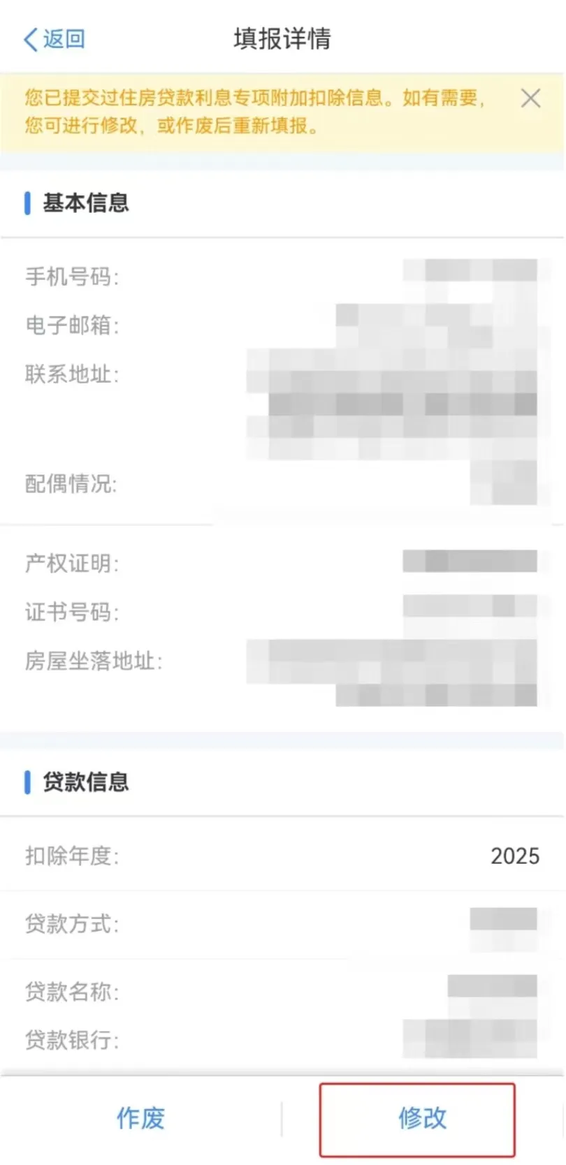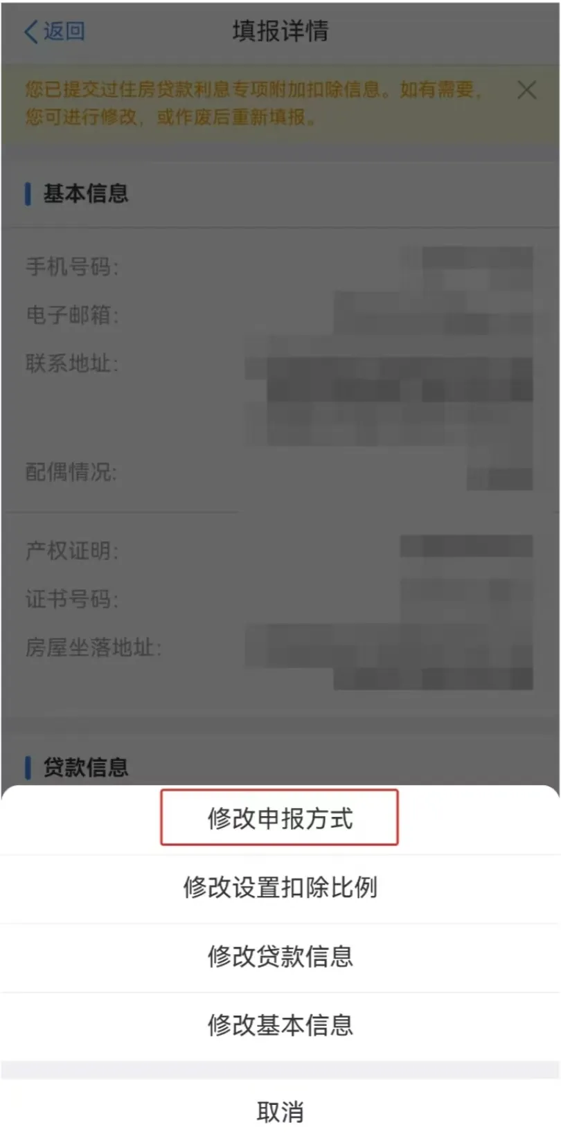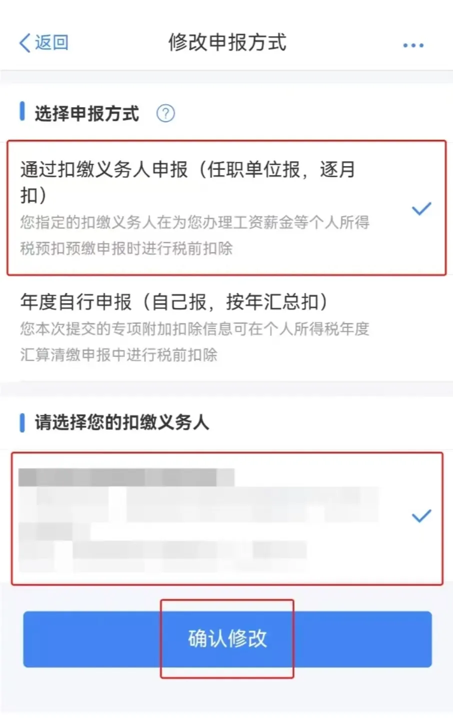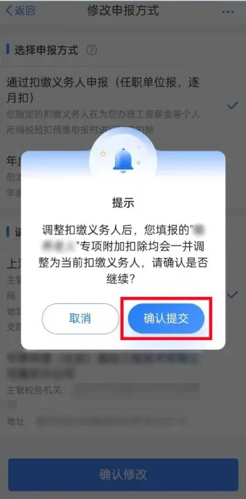 第三步:在填报详情界面,依次点击【修改】—【修改申报方式】。申报方式选择【通过扣缴义务人申报(任职单位报,逐月扣)】,扣缴义务人选择新的工作单位,点击【确认修改】—【确认提交】。