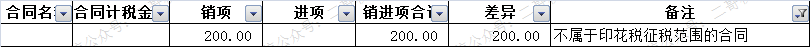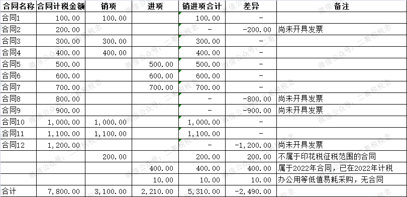 2、有进销项,无合同。有些进销项发票对应的合同类型并不属于印花税征税范围,比如公司签订的审计合同,物业合同等,这些合同公司并未计税,但是取得了相应的发票。