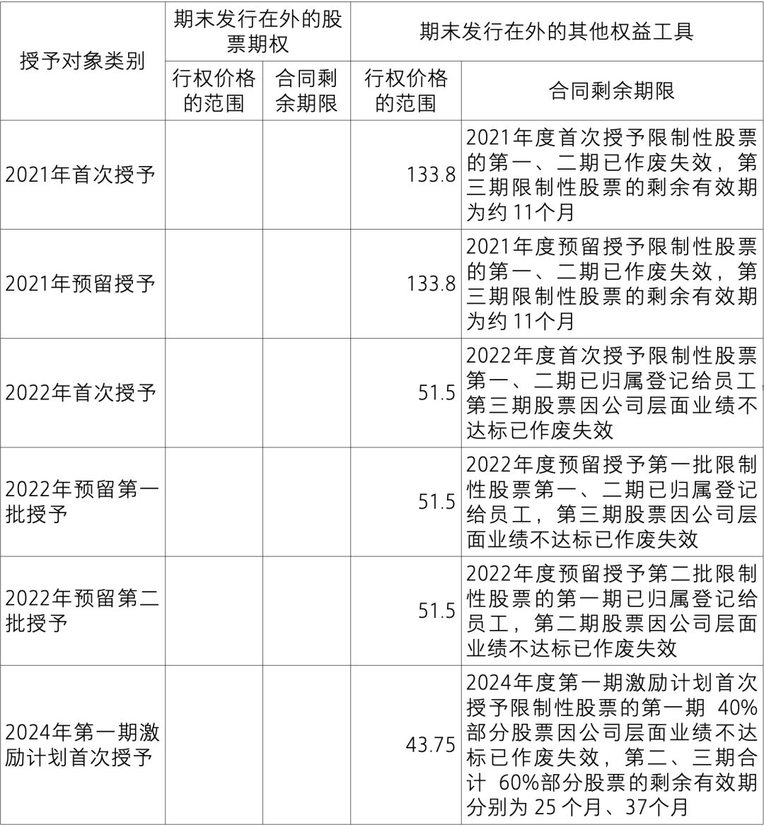 注:以上“本期行权”指,公司在 2024年度发生的 2022年度首次授予(第二期)及预留第二批(第一期)部分限制性股票的归属:以上行权价格指各期限制性股票激励计划的股票归属价格;以上合同剩余期限指,截止2024年12月31日,各年度激励计划已授出但尚未归属的限制性股票的对应剩余有效期。