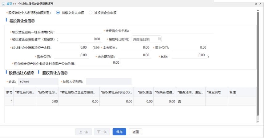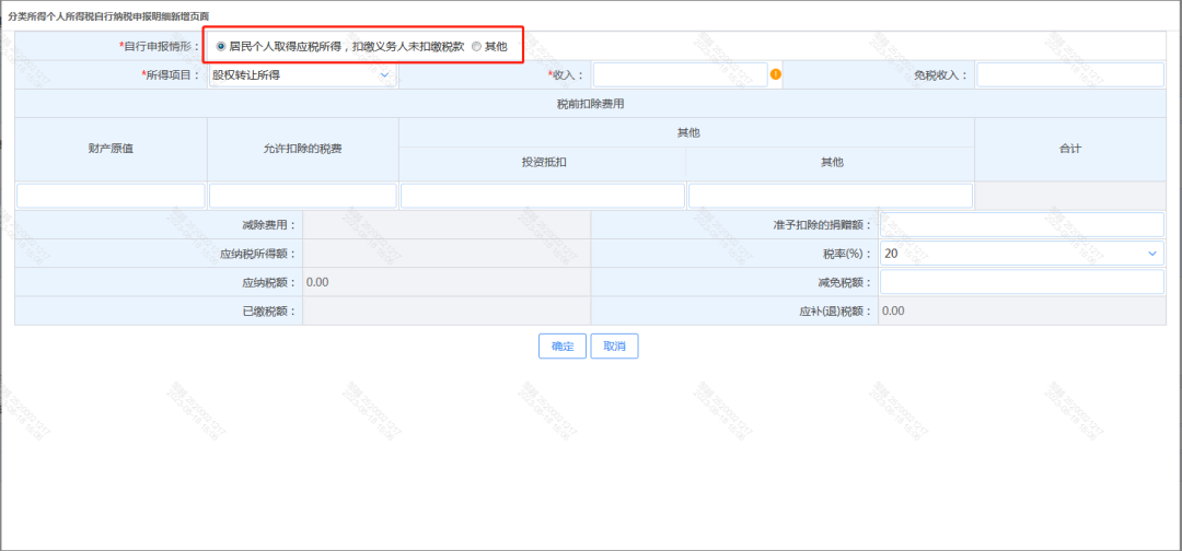 (1)股权转让个人所得税申报类型:根据个人所得税申报实际情况填写。重点注意扣缴申报时,准确区分是被投资企业申报还是扣缴义务人申报,勿混淆。