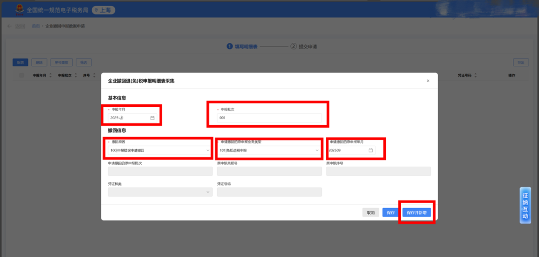 点击页面上的 “新增” 按钮,会弹出《企业撤回退(免)税申报明细表》采集界面。如申报错误则“撤回原因”选择“申报错误申请撤回”,再如实录入申请撤回的原申报业务类型、所属期、原申报批次等信息,填完后点击 “保存并新增”